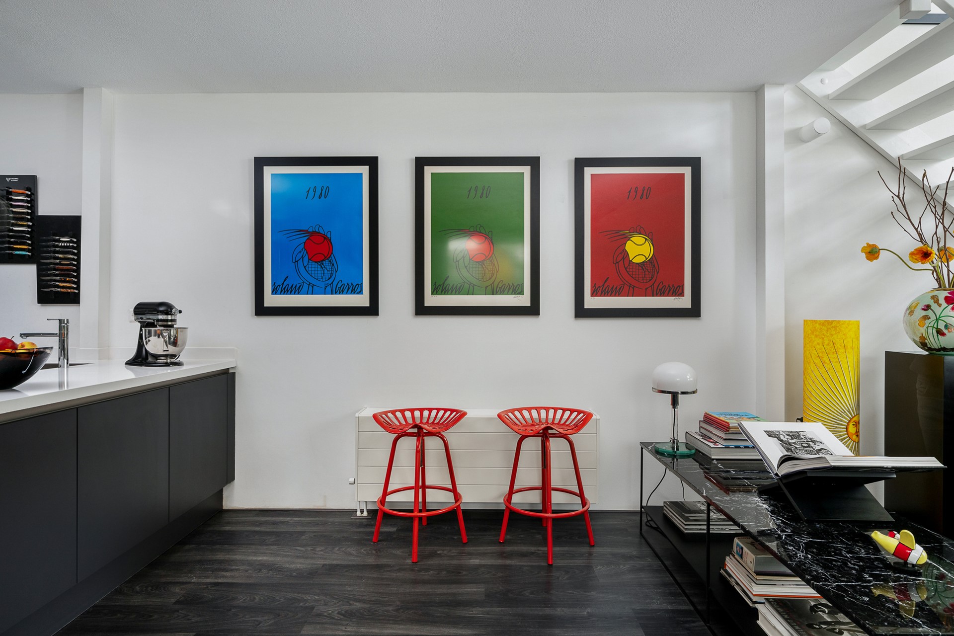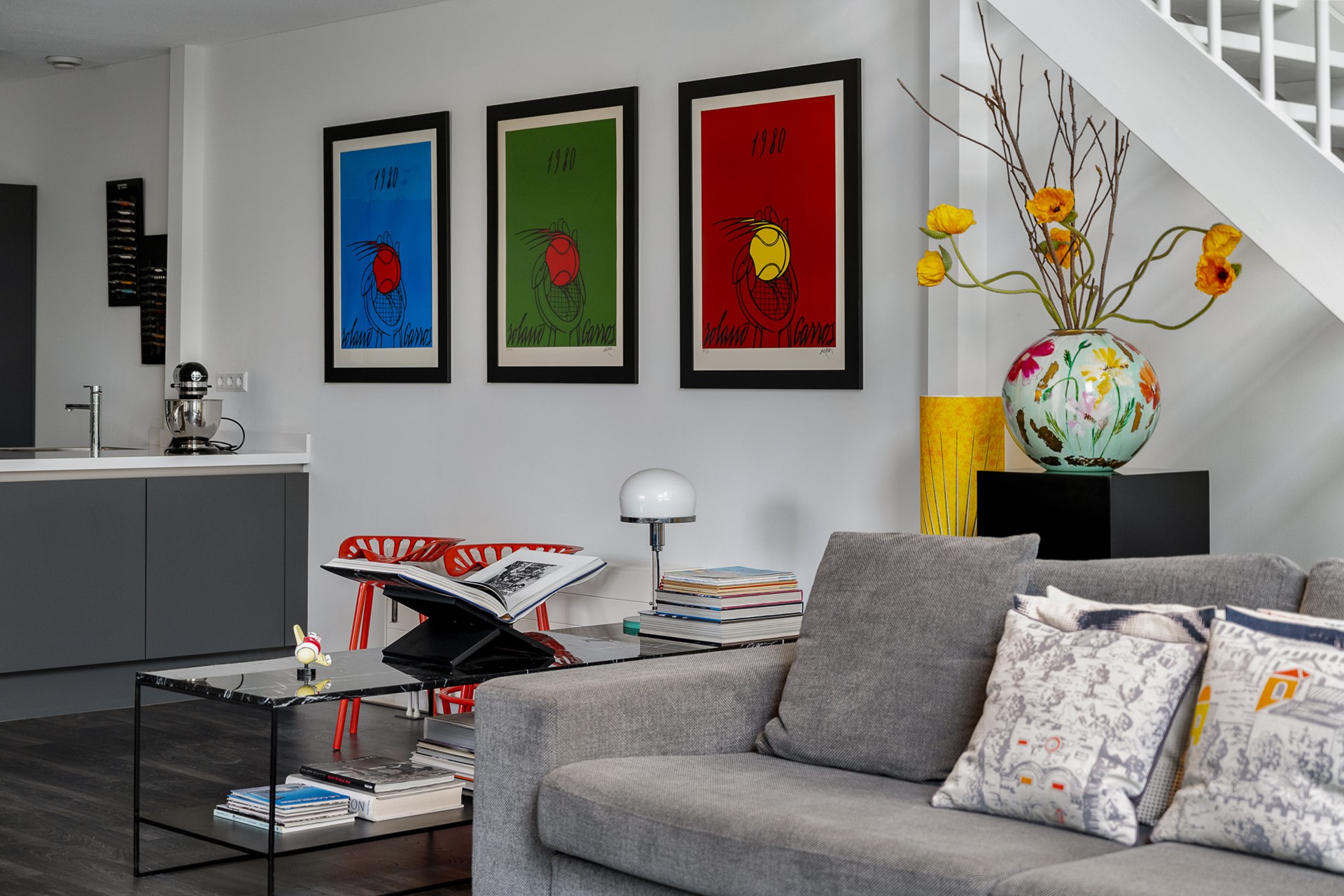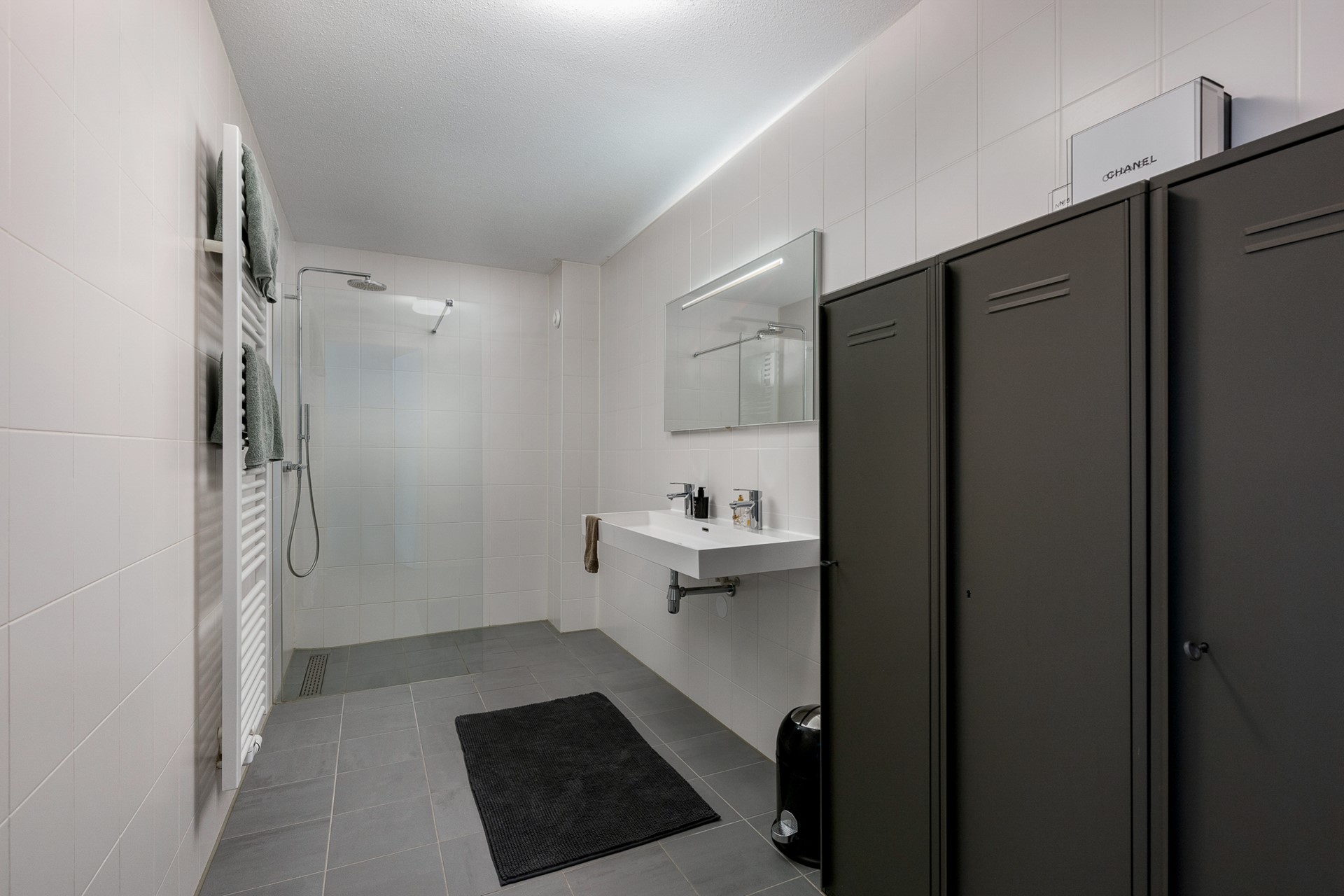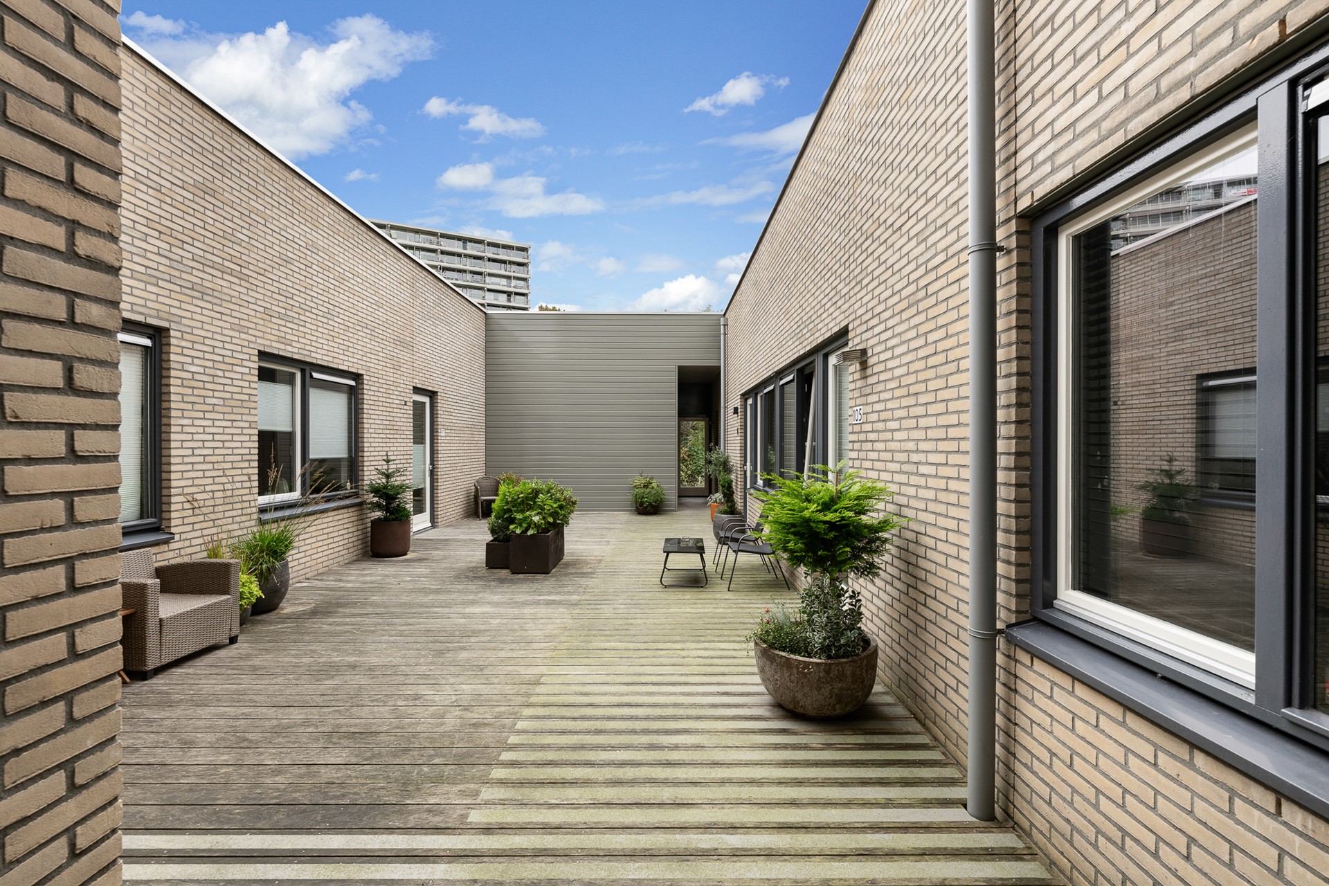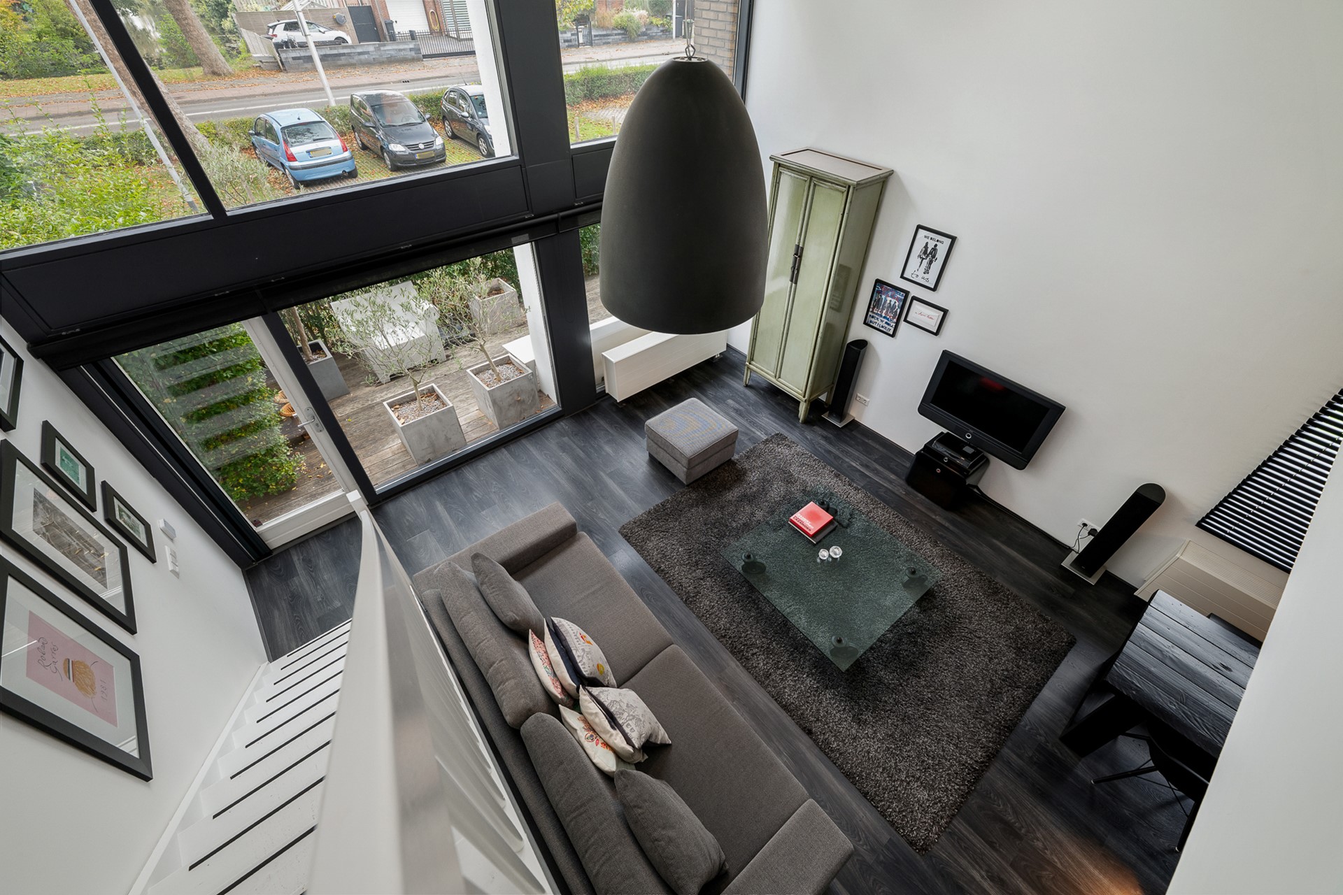 De gunstige hoekligging en grote raampartijen zorgen voor veel daglicht. De woonkamer is een echte blikvanger dankzij het hoge plafond, waarmee de charme van de voormalige gymzaal duidelijk herkenbaar is gebleven. Vanuit de woonkamer heb je toegang tot het terras, dat tevens een doorgang biedt naar de parkeerplaatsen.