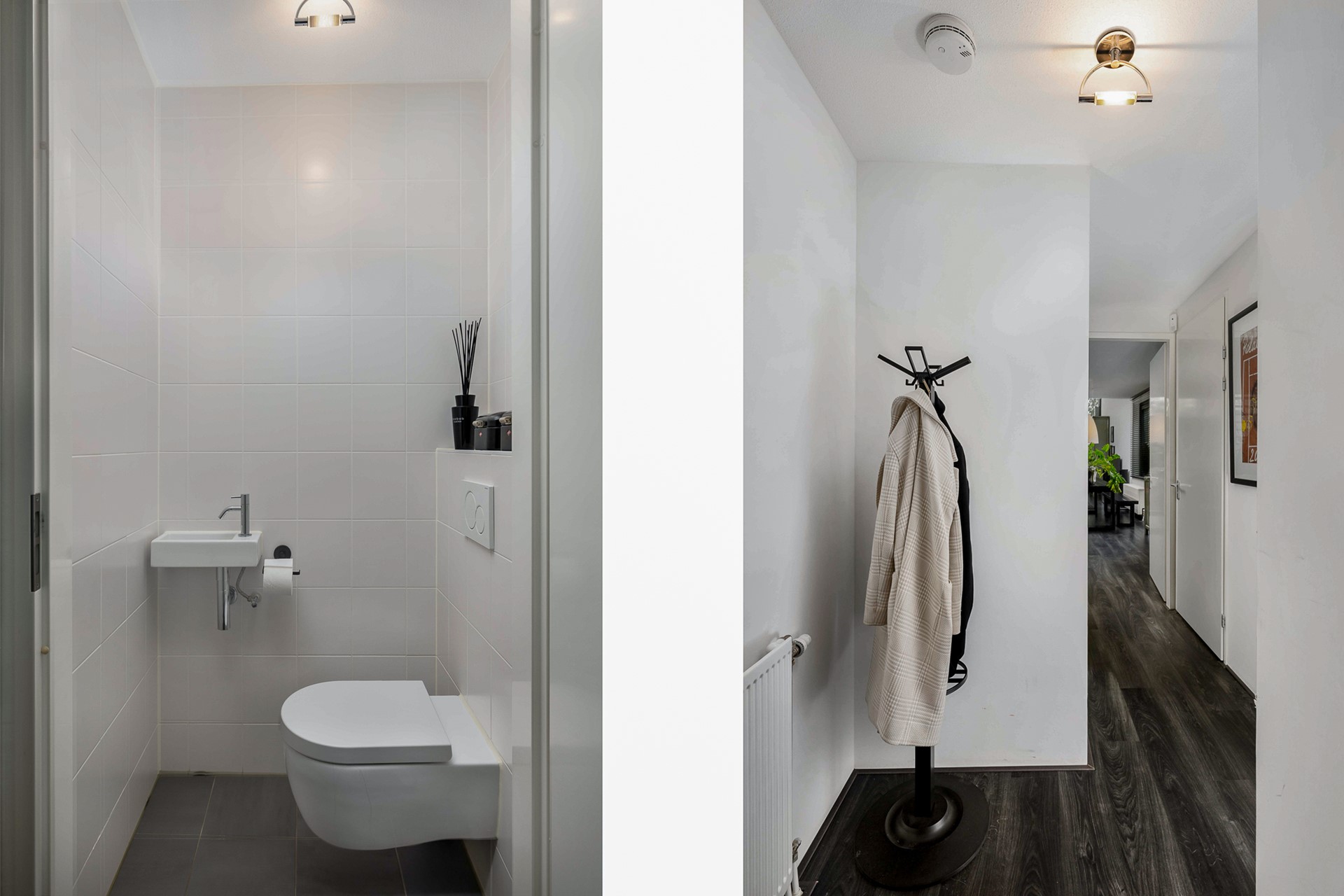 Bij binnenkomst geeft de hal toegang tot de eerste slaapkamer, een berging met wasmachineaansluiting en een separaat toilet. Vanuit de hal bereik je de ruime woonkamer (ca. 58m2) met open leefkeuken, waar comfort en stijl samenkomen.