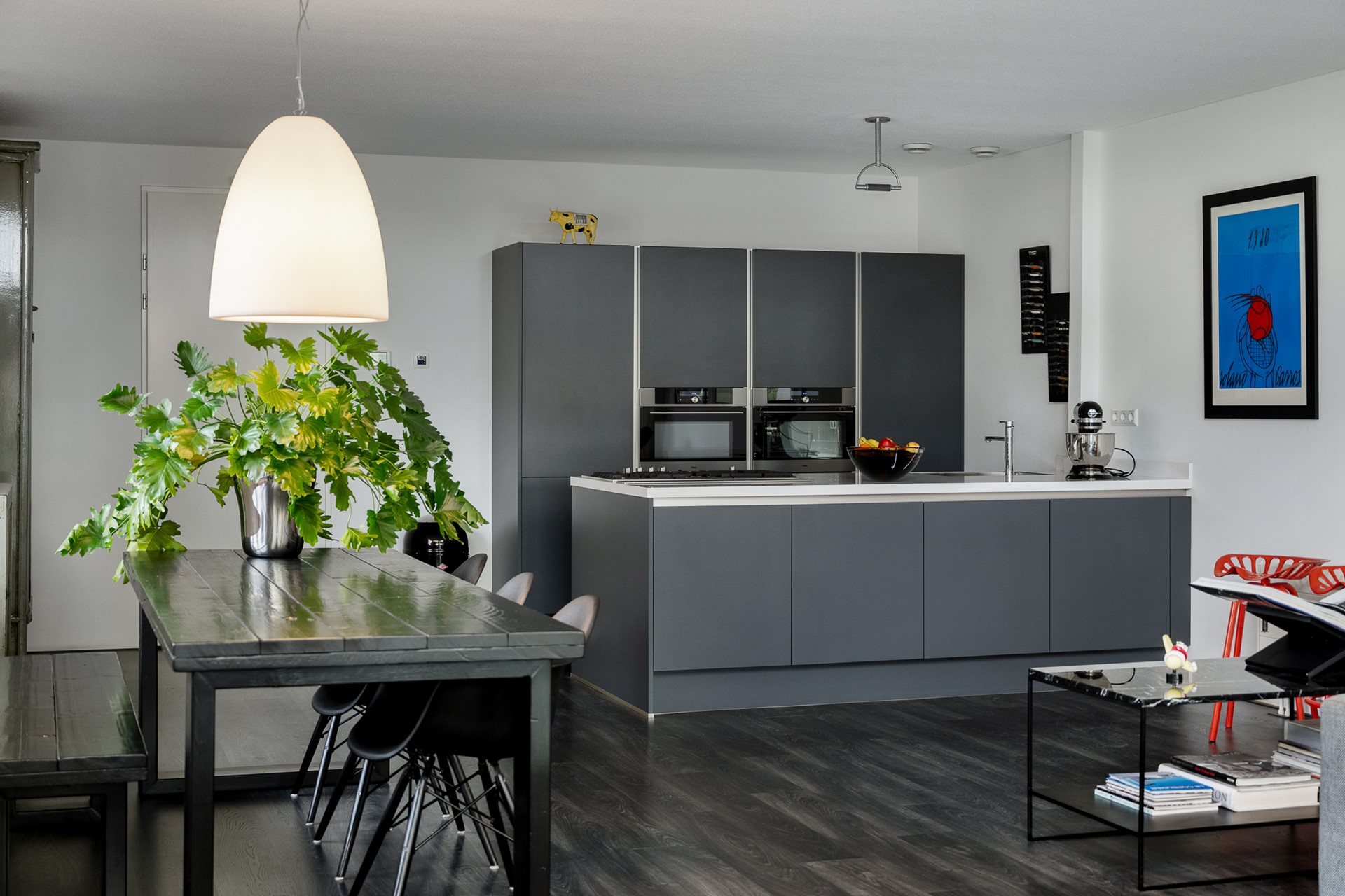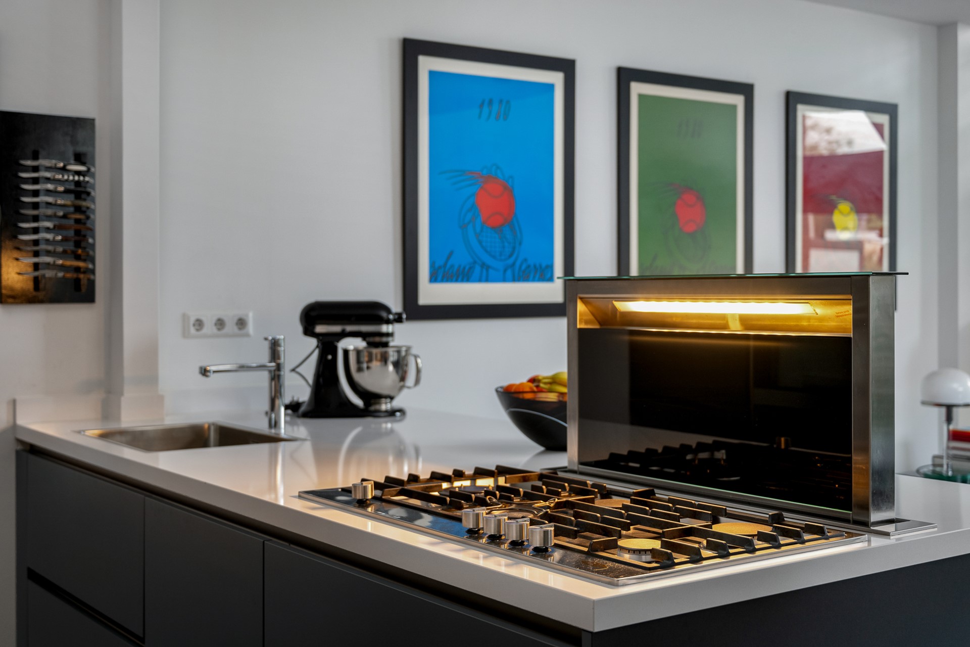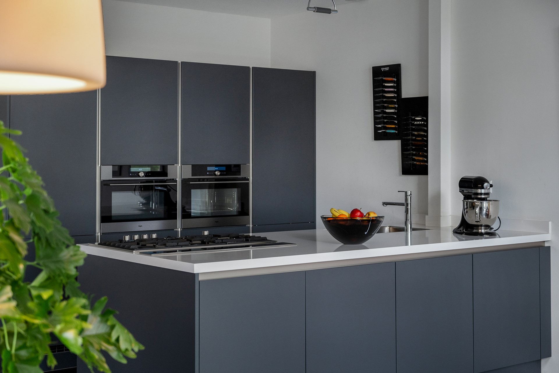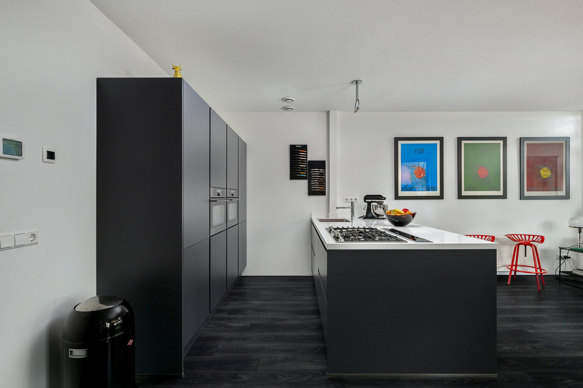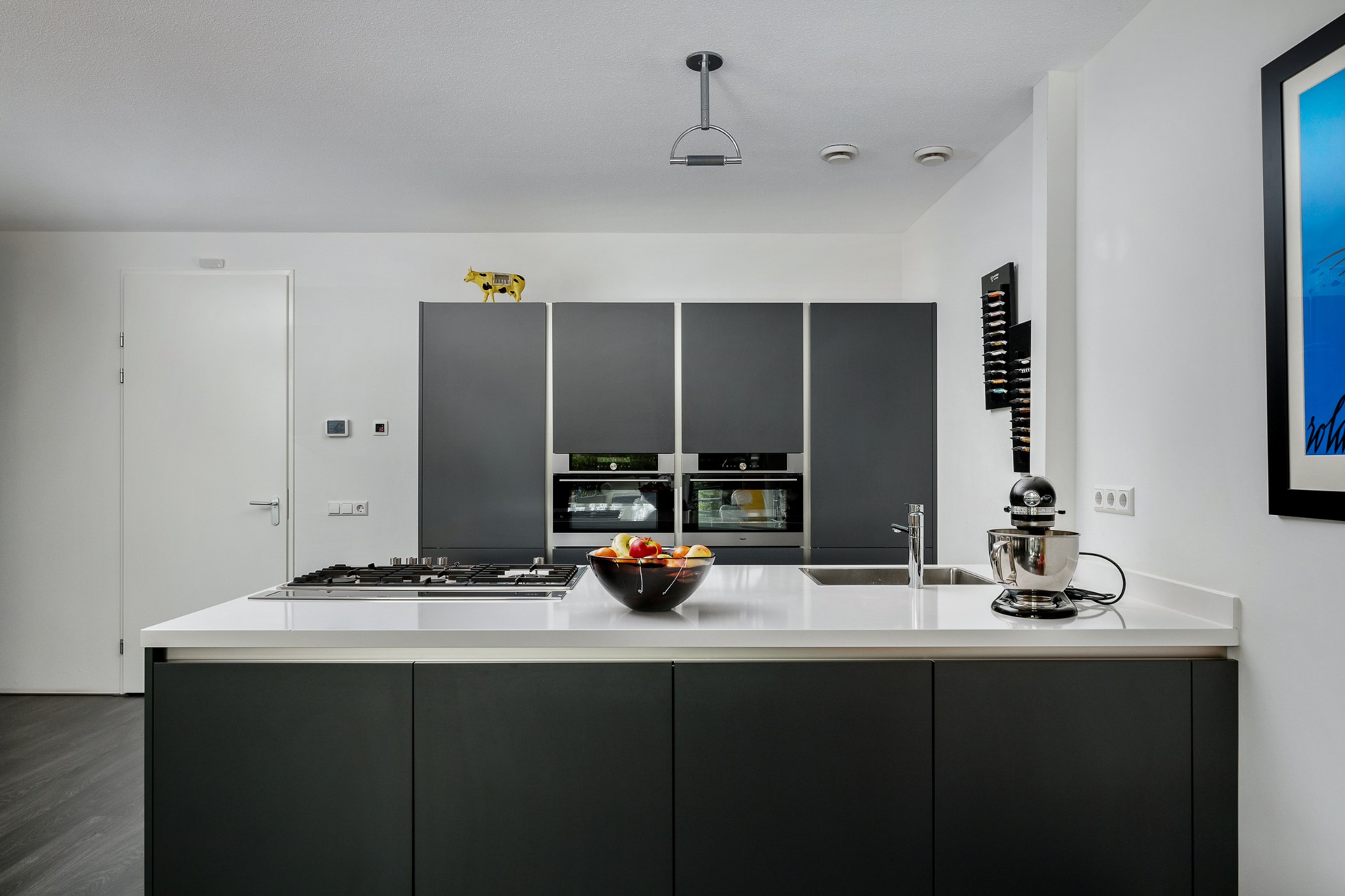 De keuken is modern uitgevoerd met een kookeiland, veel bergruimte en diverse inbouwapparatuur, waaronder een koel-vriescombinatie, oven, combimagnetron, vaatwasser en een 5-pits gaskookplaat met een afzuigkap geïntegreerd in het aanrechtblad.