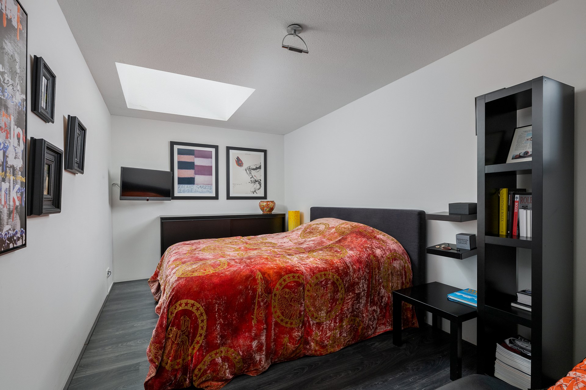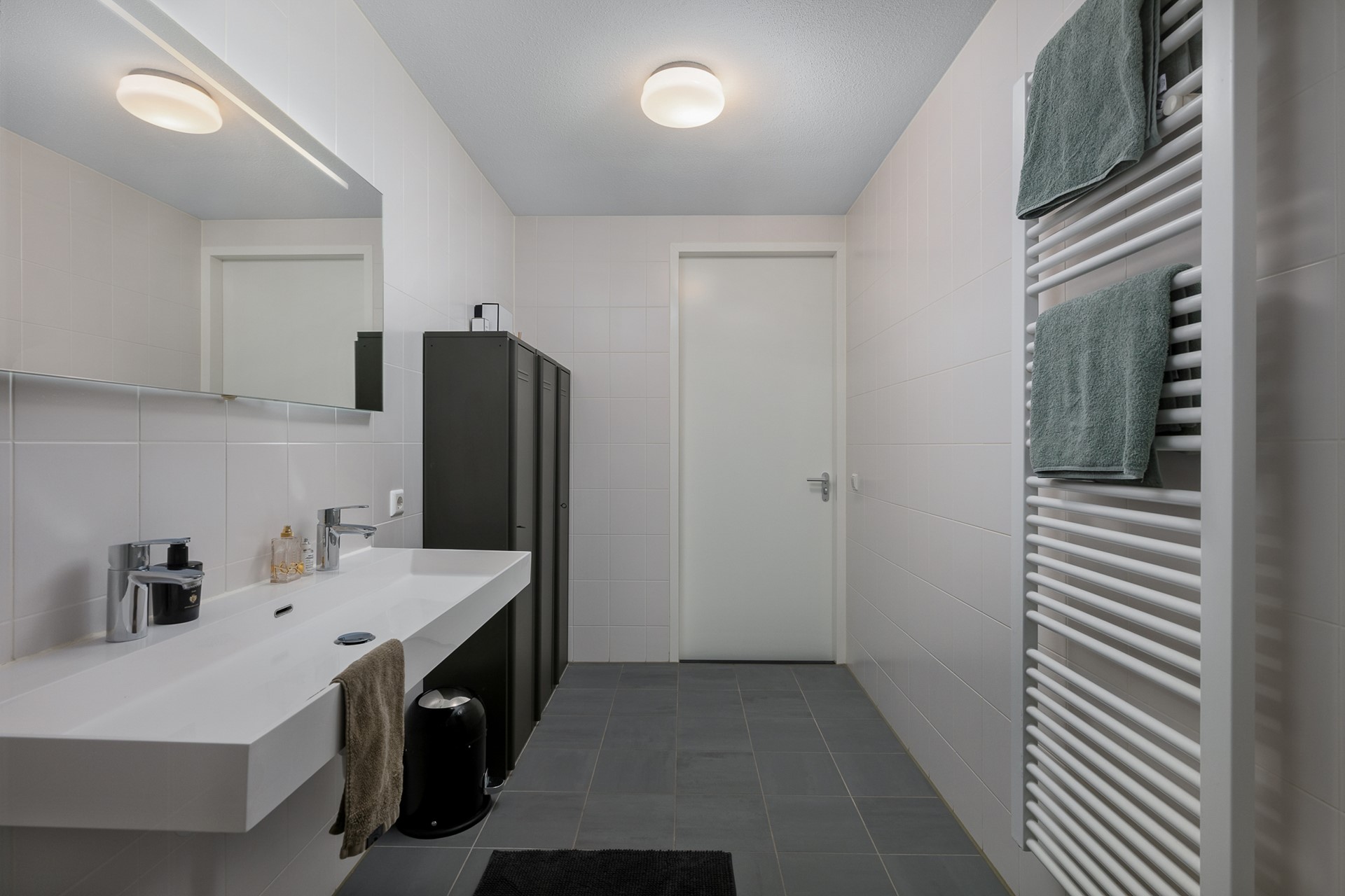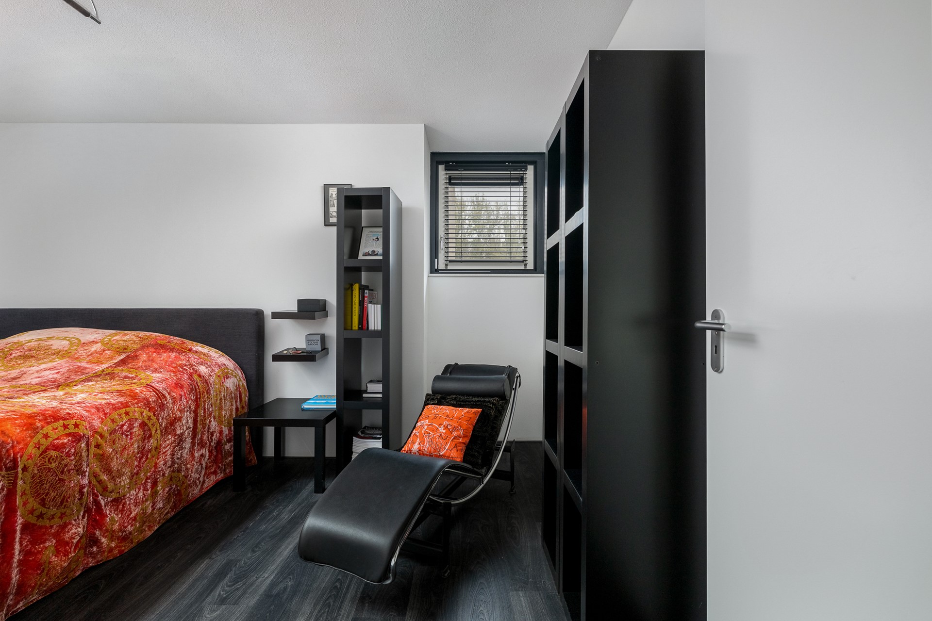 Via de trap in de woonkamer bereik je de eerste verdieping, met twee slaapkamers en de badkamer. De hoofdslaapkamer beschikt over een lichtkoepel, wat zorgt voor extra dynamiek en veel daglicht. De tweede slaapkamer is momenteel ingericht als inloopkast, maar biedt voldoende ruimte om te gebruiken als kantoor of logeerkamer. De badkamer is modern afgewerkt en voorzien van een inloopdouche en een dubbele wastafel.