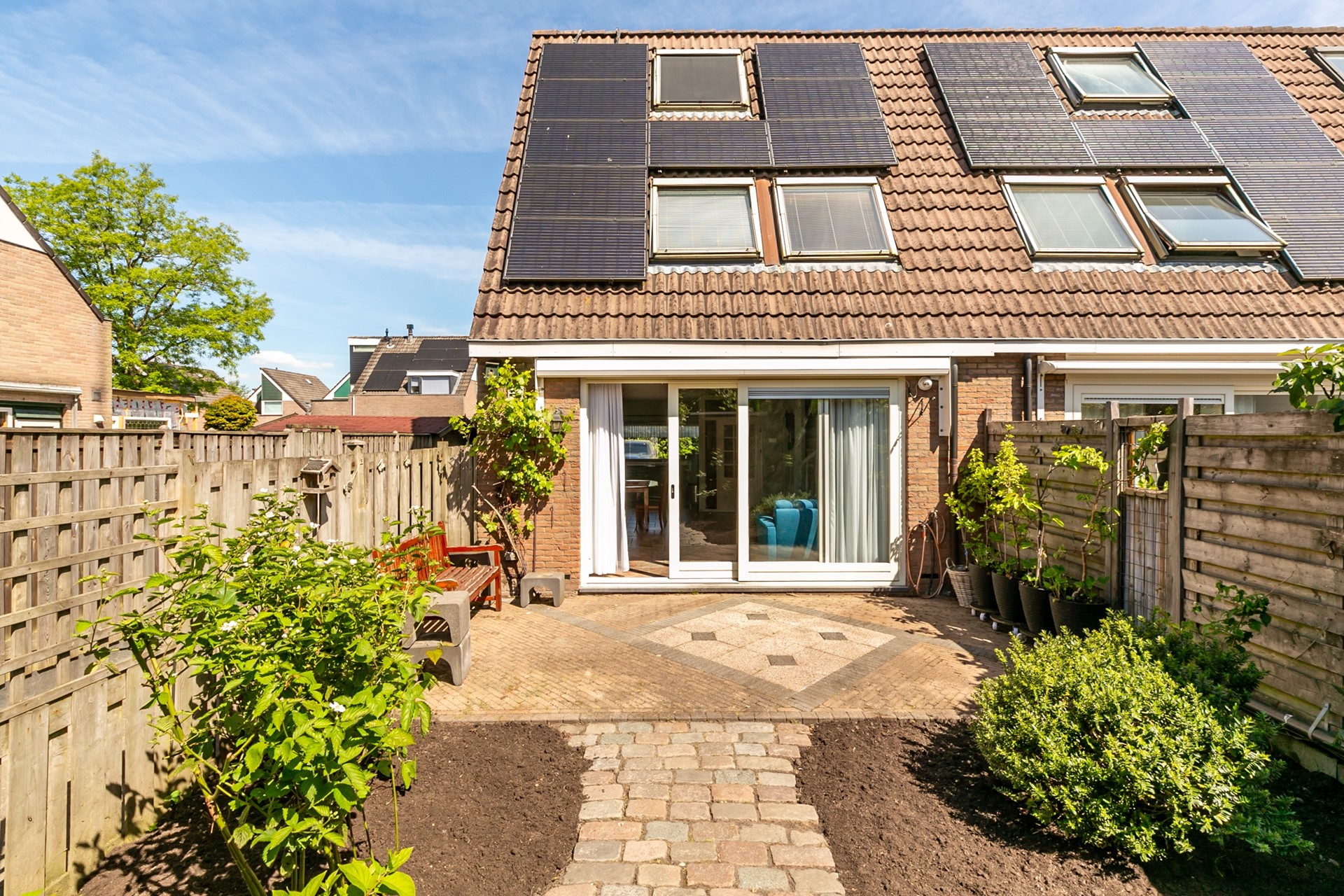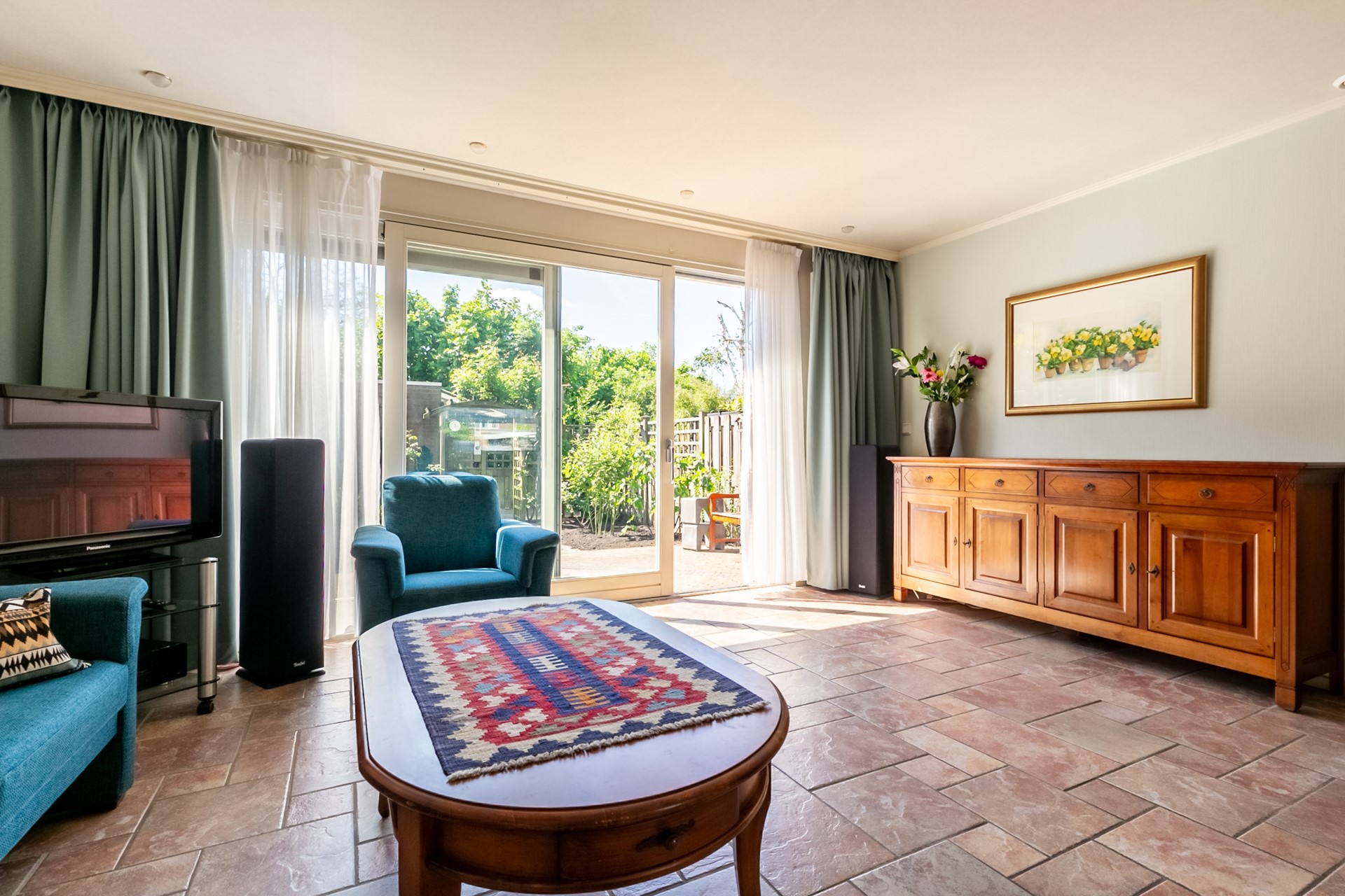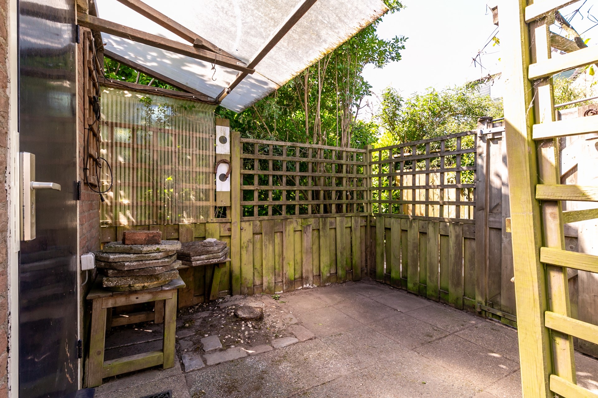 Vanuit de hal loopt u door naar de lichte woonkamer, waar de grote schuifpui zorgt voor een mooie verbinding met de zonnige achtertuin. Hier kunt u een comfortabele zithoek creëren om optimaal te genieten van het buitenleven. Achterin de tuin vindt u een stenen berging, ideaal voor uw fietsen, gereedschap of andere spullen.
