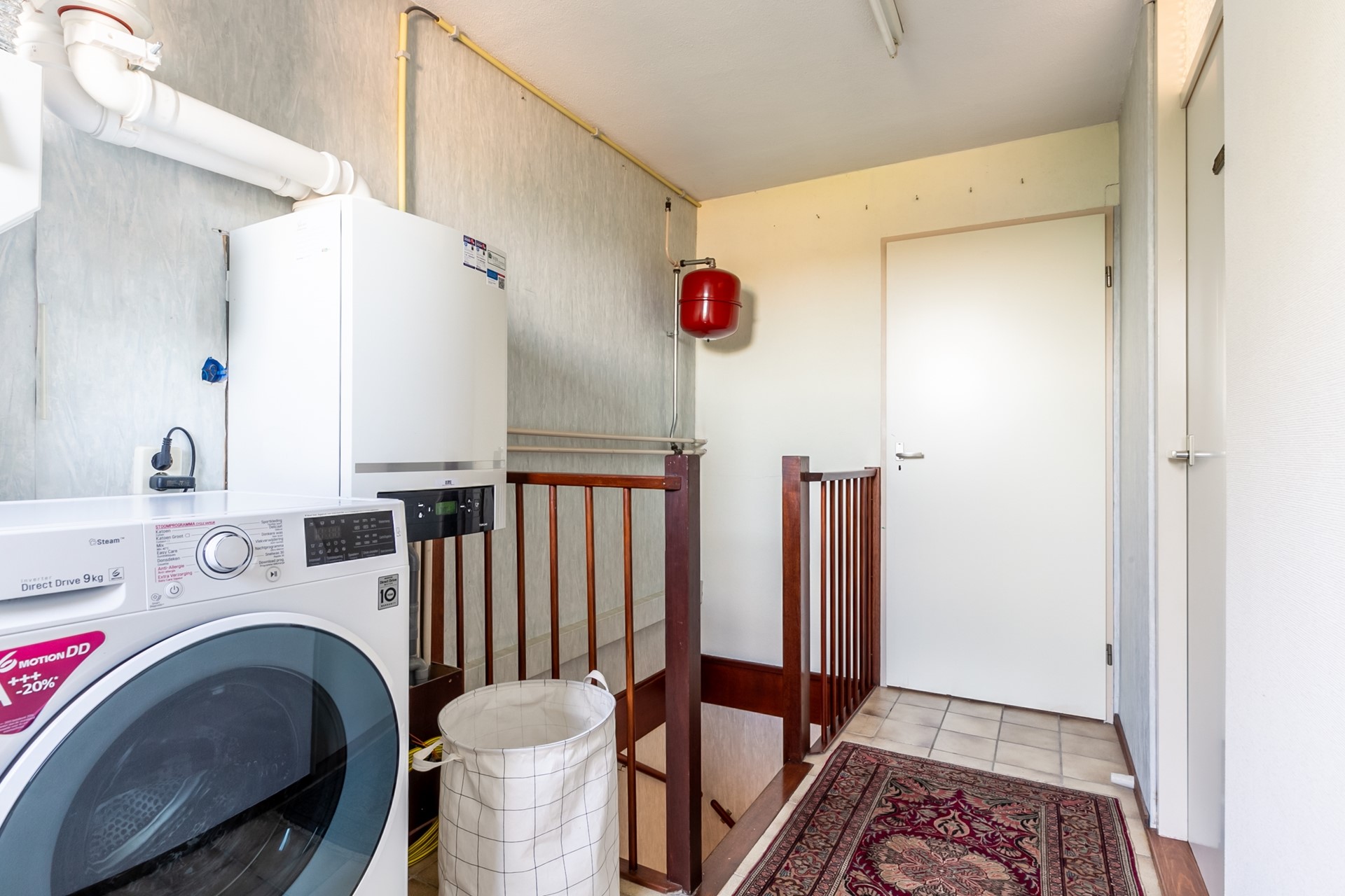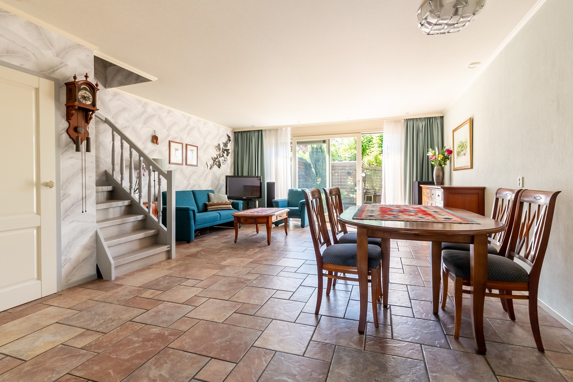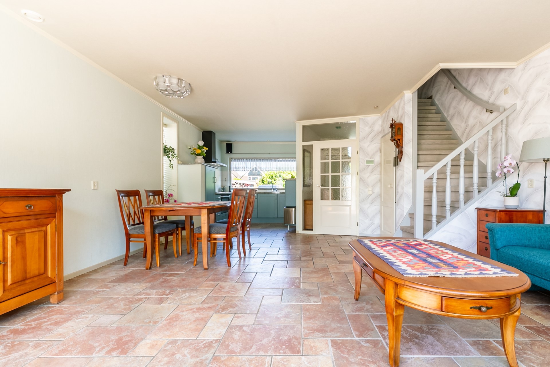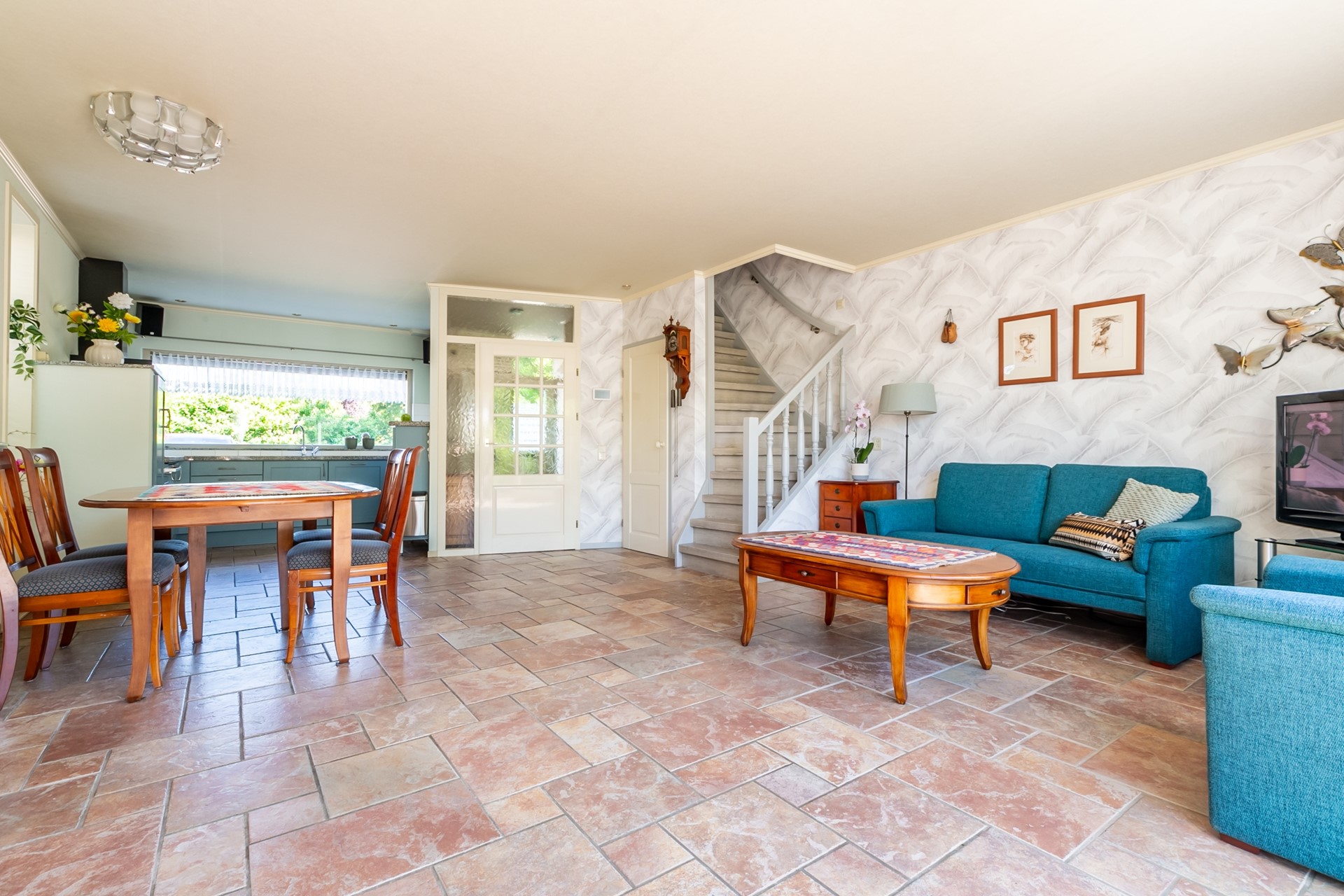In de woonkamer bevindt zich de trap naar de eerste verdieping, met daaronder een praktische trapkast voor extra opbergruimte.